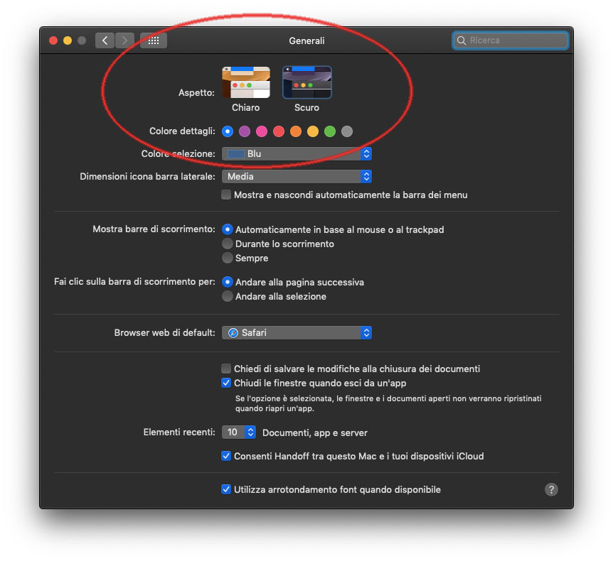 La nuova modalità scura di macOS Mojave può essere attivata e disattivata andando nella sezione “Generali” delle Preferenze di Sistema, selezionando la voce “Chiaro” (modalità tradizionale) o “Scuro” (la modalità Dark) alla voce “Aspetto”.