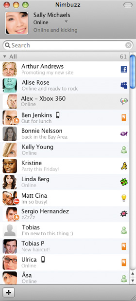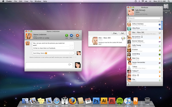 Con il nuovo programma Nimbuzz per Mac è possibile comunicare e interagire con i contatti dalle più famose community di instant messaging e social network tra cui Facebook, AIM, MySpace, Google Talk (Orkut), Yahoo! Messenger, Windows Live Messenger (MSN), ICQ e molti altri ancora direttamente dal Mac. Nimbuzz per Mac diventa così uno dei software di chat e VoIP più completi, inoltre gli sviluppatori hanno migliorato l’interfaccia rendendola più leggera e più in linea con Mac OS X. Oltre alla nuova versione per Mac Nimbuzz ha reso disponibile anche una nuova versione del client per iPhone.