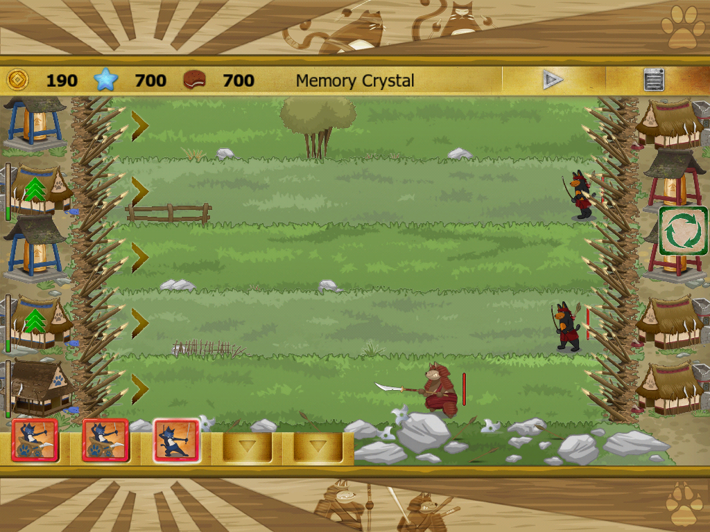 Ninja Cats Vs Samurai Dogs unisce sapientemente elementi tipici degli videogame stile difesa della torre e i giochi di ruolo (RPG). Il campo di battaglia è diviso in cinque corsie in cui bisogna piazzare strategicamente una o più torri per evitare che l’avversario raggiunga il proprio quartier generale. Quando un nemico percorre una delle corsie protette dalla torre, inizia lo scontro.