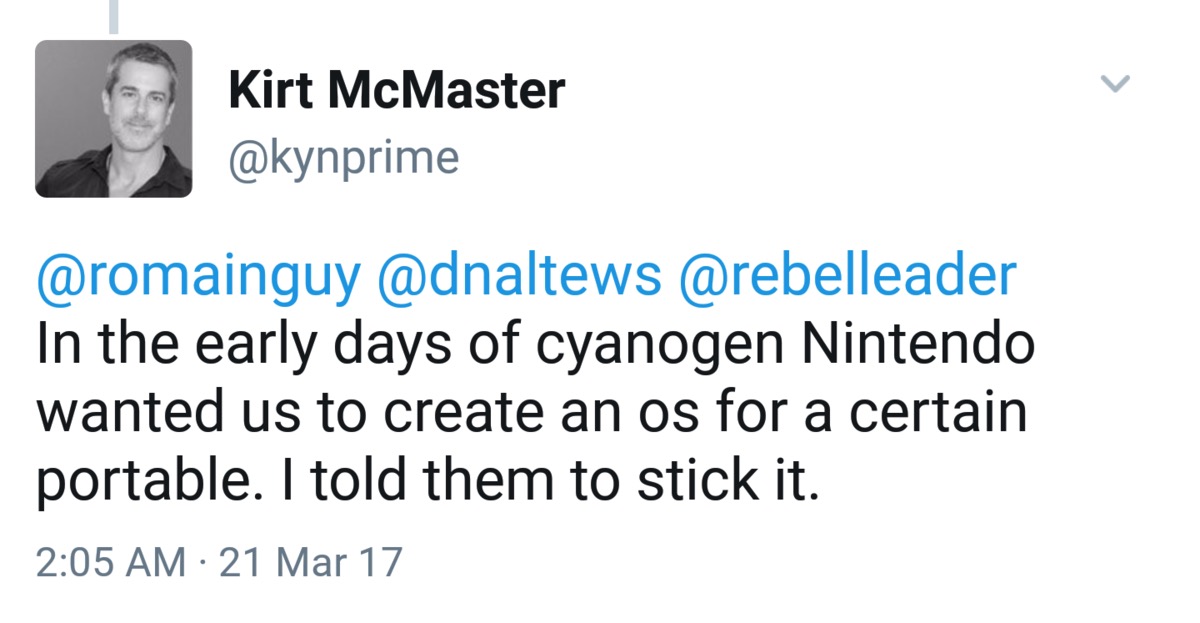 Il sistema operativo sarebbe stato irriconoscibile come Android, il che non è quello che voleva Cyanogen, e per questa ragione McMaster ha sostanzialmente mandato a quel paese Nintendo. Kirt ha continuato a twittare che sarebbe interessato a una versione 2, che potrebbe funzionare come un vero e proprio dispositivo mobile con una connessione dati. A questo punto, soprattutto se Nintendo Switch continuerà ad avere il successo che ha raccolto in questi primi giorni dall’uscita, probabilmente sarà difficile vedere Android su un dispositivo della casa di Kyoto, anche se il solo pensiero di aver considerato l’opzione rappresenta una grande apertura per Nintendo.