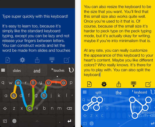 La particolarità di Nintype consiste nella possibilità di alternare, durante la digitazione di un testo, tap e slide, mentre attualmente tutte le tastiere prevedono queste due tipologie di digitazione come metodi alternativi. Nintype, inoltre, a differenze di altre tastiere che invitano l’utente a scrivere con una sola mano, si basa interamente su una digitazione a due mani. Fortunatamente, nel garantire un passaggio indolore da una tastiera tradizionale a Nintype, la stessa applicazione offre inizialmente un lungo tutorial per apprendere i trucchi base, o avanzati, per poter scrivere ancor più velocemente sfruttando tutte le scorciatoie previste.