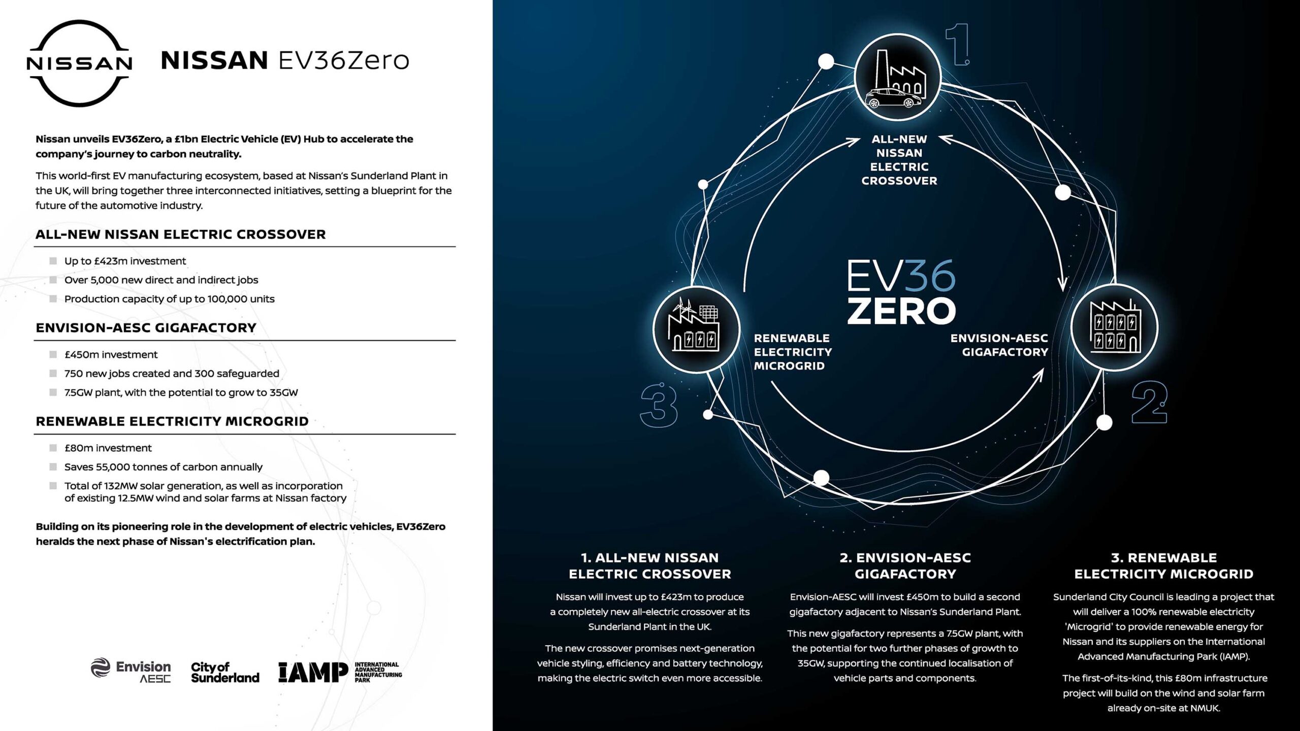 Il progetto è stato lanciato da Nissan e dai suoi partner, Envision AESC, produttore di batterie leader a livello mondiale, e il Consiglio Comunale di Sunderland. Nissan EV36Zero riunisce in sé tre elementi interconnessi fra loro, i veicoli elettrici, le energie rinnovabili e la produzione di batterie, creando così un nuovo modello a 360 gradi per la produzione automobilistica a zero emissioni, fornendo una spinta decisiva verso l’obiettivo dell’azienda giapponese di neutralità totale dal carbonio.