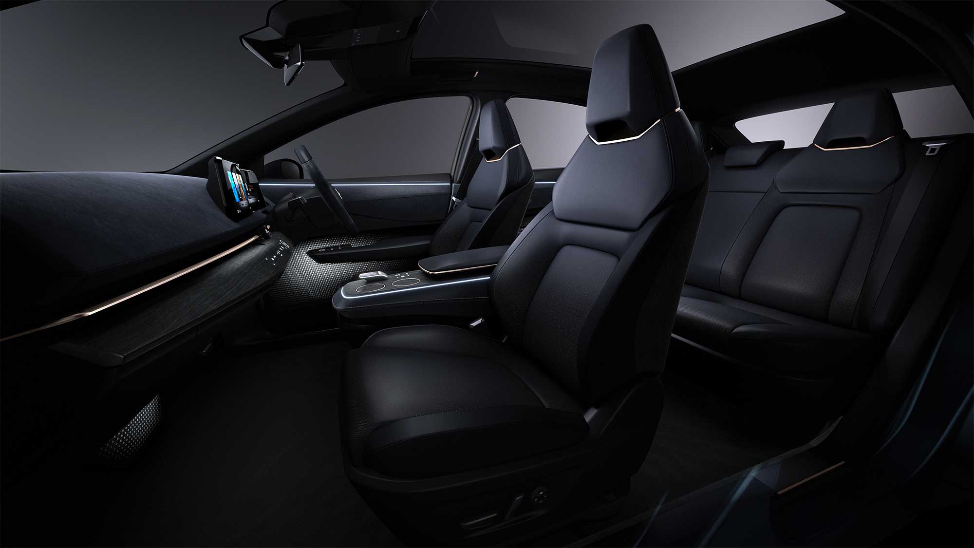 La plancia minimalista non prevede la presenza di numerosi pulsanti e interruttori che si trovano nei veicoli tradizionali. Quando il concept è alimentato, i controlli touch integrati compaiono illuminandosi nel quadro strumenti. Quando l’automobile non è in uso, i controlli spariscono confondendosi con la superficie. Gli unici comandi fisici sono il pulsante di avviamento, una sola manopola per operare sul monitor da 12,3 pollici, e i controlli del climatizzatore, integrati nella parte inferiore del quadro strumenti in vero legno. Il quadro strumenti si integra nelle portiere e negli interni, per rendersi invisibile quando non è in uso.