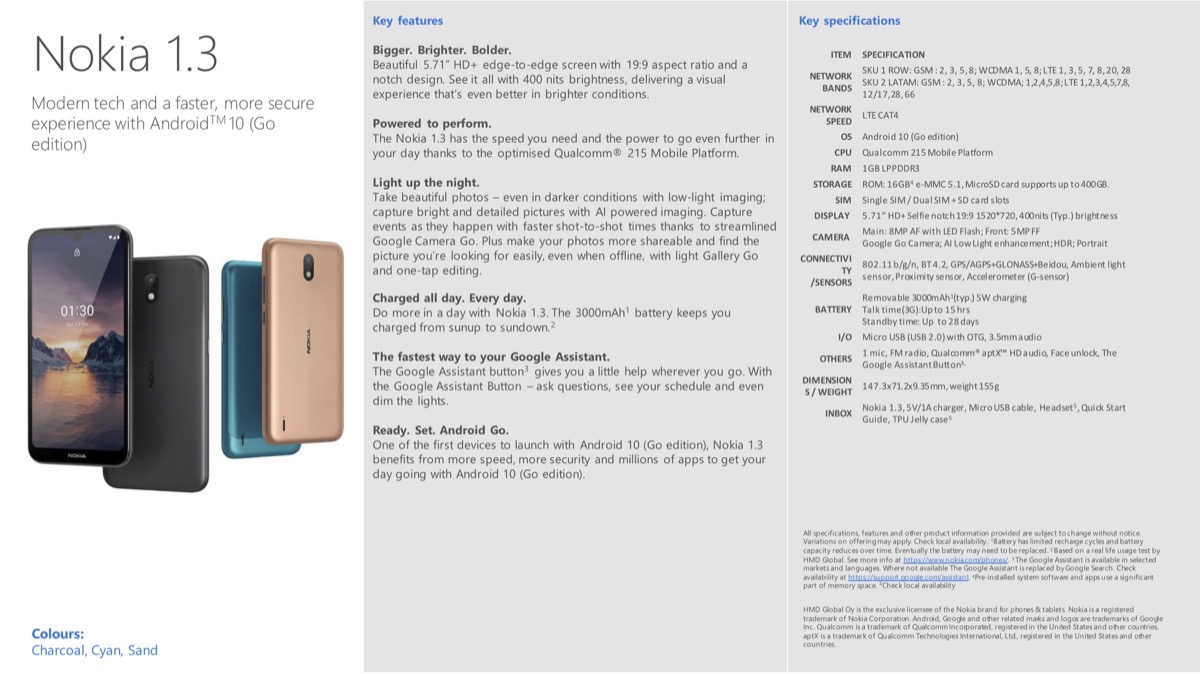 Quarta e ultima novità dell’azienda è il Nokia 1.3 (da maggio nei colori Cyan, Sand e Charcoal al prezzo di 109 euro), dotato del sistema operativo Android 10 Go Edition (aggiornabile poi alla versione 11 del medesimo) e tra i primi smartphone ad essere lanciati con Camera Go, tecnologia low-light AI image fusion, Gallery Go e un luminoso schermo HD+ edge-to-edge.