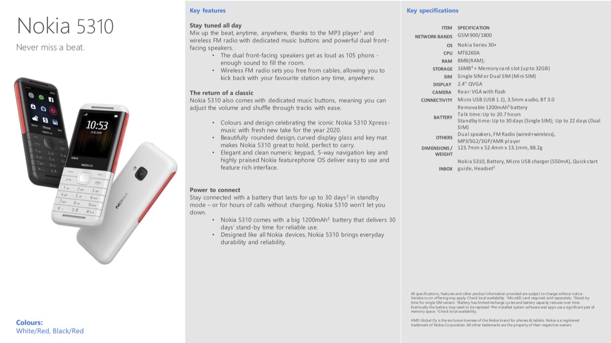 Partendo proprio da quest’ultimo, si tratta del Nokia 5310 (da maggio nei colori White/Red e Black/Red al prezzo di 49 euro) che riprende funzioni e design dall’originale Nokia 5310 Xpress Music, tra i primi dell’epoca (era il 2007) che permettevano di portarsi la propria collezione MP3 attraverso il cellulare.
