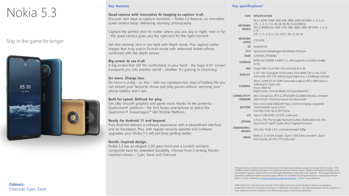 Uno dei due ulteriori smartphone appena annunciati è il Nokia 5.3 (da maggio nei colori Cyan, Sand e Charcoal nella versione da 4GB/64GB RAM/ROM al prezzo di 219 euro), dotato di Android 10, ampio schermo da 6,55”, processore Qualcomm Snapdragon 665 e un sistema di quattro fotocamere – di cui un grandangolo e un macro – che incorpora la tecnologia di intelligenza artificiale per facilitare l’acquisizione dello scatto migliore possibile anche in condizioni di scarsa illuminazione grazie alla modalità Notte.