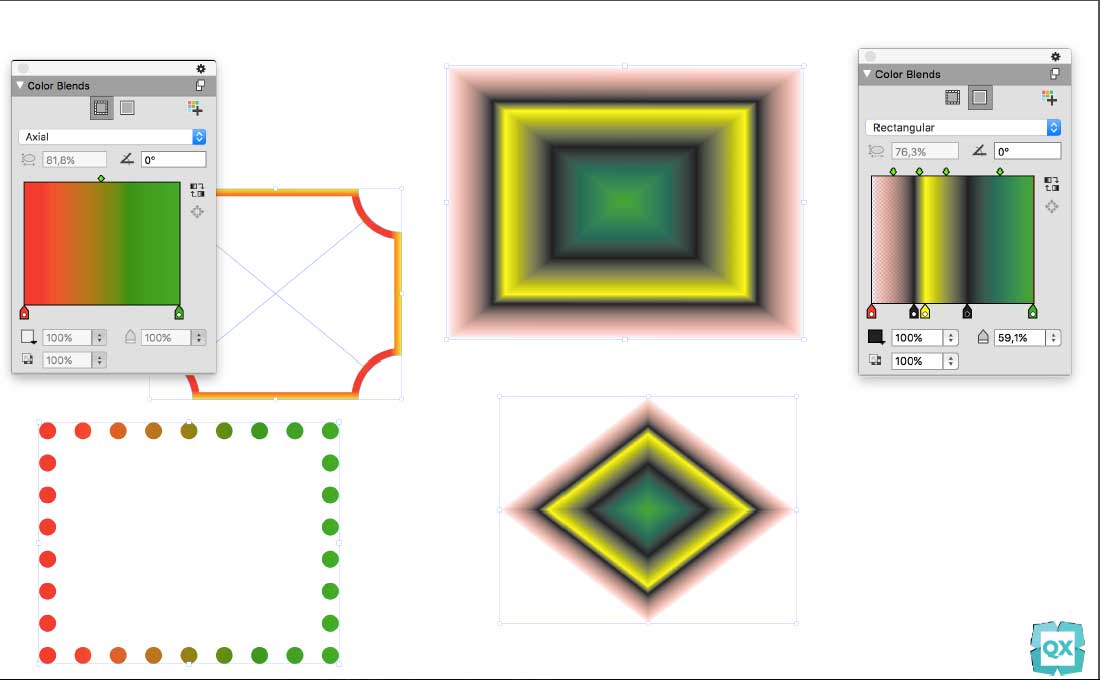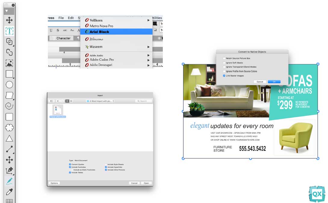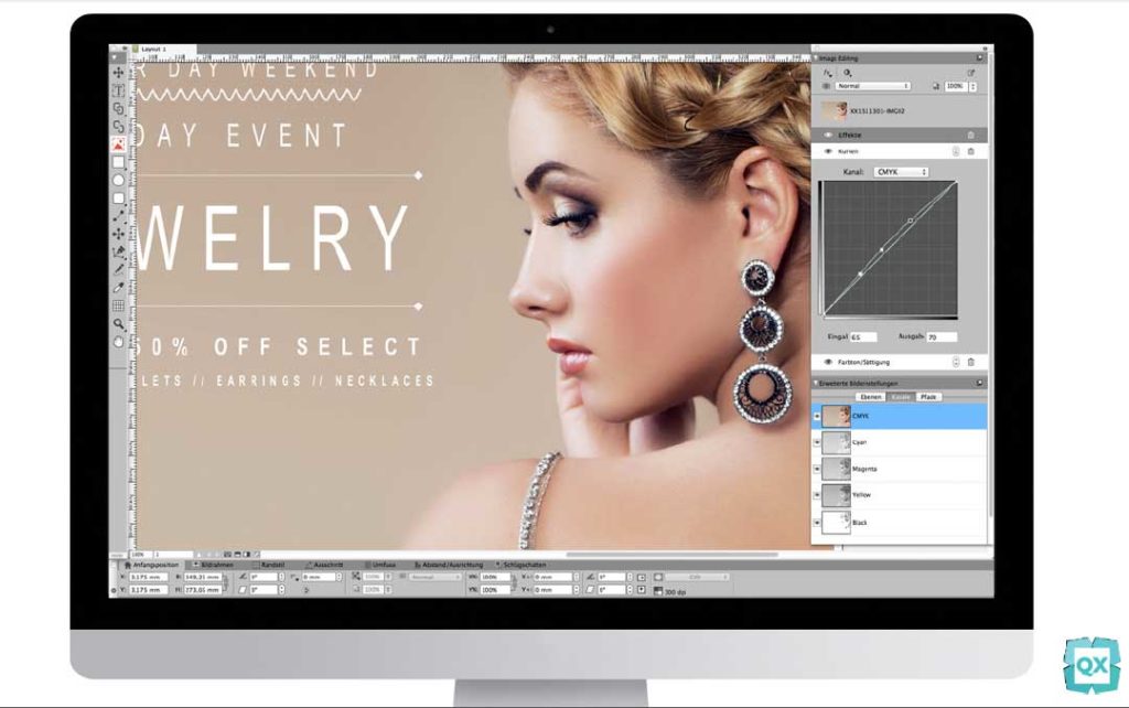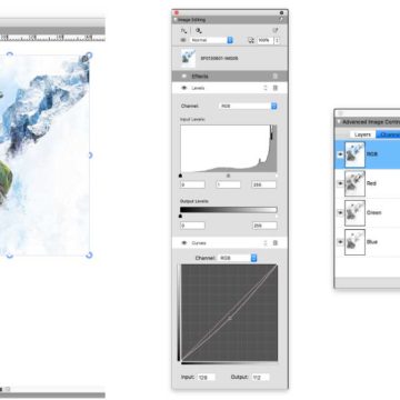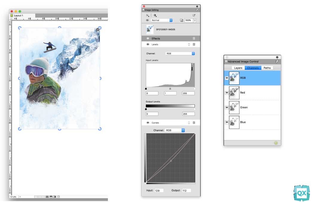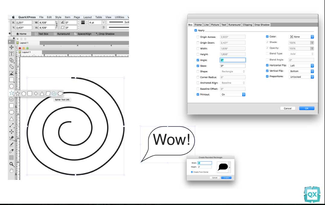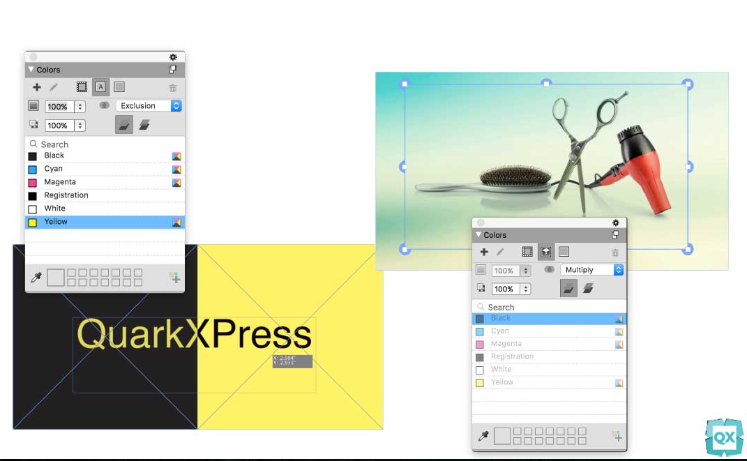 Una della novità è il supporto a funzionalità di editing non distruttivo delle immagini direttamente dal programma, con filtri e strumenti che consentono di modificare un’immagine direttamente nel layout, strumenti per tagliare, ricampionare, modificare colori (tenendo conto dei profili ICC). Sono supportati i metodi di fusione, con funzioni che consentono di applicare in blending anche tra immagini e sfondo per creare effetti artistici, strumento che funziona con i testi e qualsiasi altro elemento in Xpress. È possibile gestire gradienti con colori multipli definendo il punto iniziale e il punto finale modificando l’aspetto della sfumatura, elementi che è possibile applicare anche alle linee e ai bordi. Un nuovo strumento contagocce permette di scegliere e applicare velocemente un effetto (si possono selezionare gli attributi da copiare) e lo strumento “forme” permette di creare tracciati con forme di vario tipo.