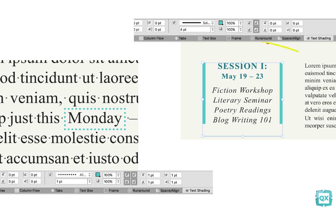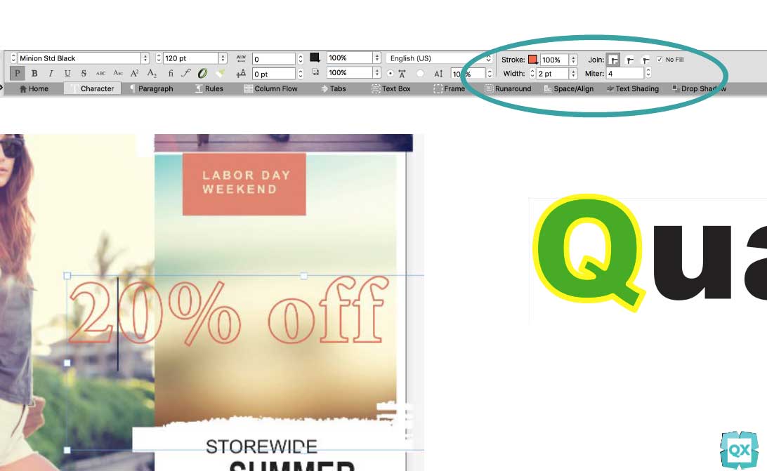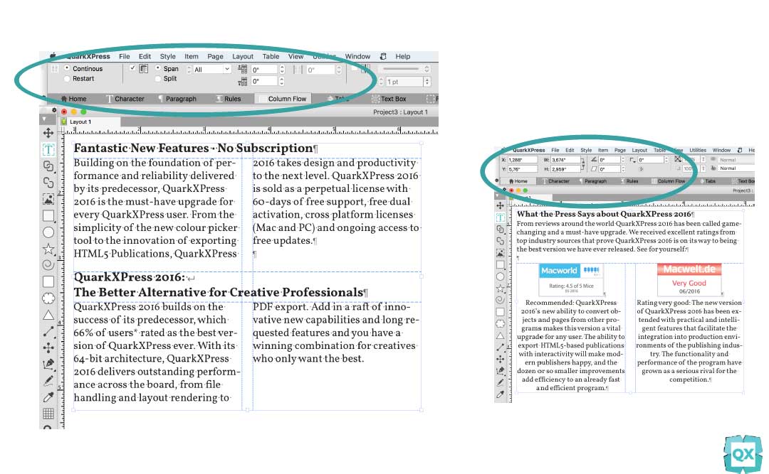 Per quanto riguarda il testo è possibile creare effetti di stroking senza bisogno di convertire i box (il testo rimane editabile). È possibile specificare colori diversi per bordi e riempimento dei caratteri, specificare una modalità trasparente per il riempimento dei caratteri e tenere conto di questi attributi negli stili. Non mancano funzioni che consentono di applicare ombreggiature a singoli caratteri o parole. Ai riquadri con elementi di testo è possibile applicare linee, tratteggi, strisce, gradienti, anche con ombreggiature e gradienti. Le colonne possono essere a loro volta divise in altre colonne (senza creare nuovi box) e sfruttare molte nuove funzionalità specifiche. È possibile gestire il leading dei testi (la spaziatura verticale) in modo proporzionale tenendo conto di 33 diverse impostazioni concernenti gli stili.