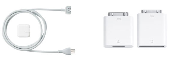 La gamma di accessori Apple per iPad include poi anche un alimentatore esterno USB che permette di ricaricare iPad direttamente da una presa della corrente a muro. Le dimensioni dell’alimentatore sembrano ridottissime a giudicare dalla prime immagini disponibili. Oltre all’iPad Dock, in pratica una base di appoggio che permette di mantenere in posizione in tablet e di ricaricarlo, risulta molto utile e interessante anche l’iPad Camera Connection Kit. Questo accessorio sembra composto da due elementi: uno permette di collegare iPad alle fotocamere digitali USB direttamente, l’altro permette di trasferire le foto al tablet direttamente da una schedina SD.