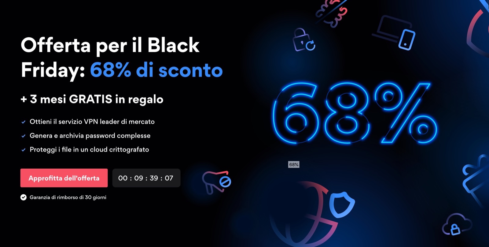 Se vi serve una VPN, con le offerte del Black Friday potete comprare NordVPN in offerta a partire da 2,99 € al mese e, in base al piano scelto, risparmiare fino al 68% rispetto al prezzo di listino.