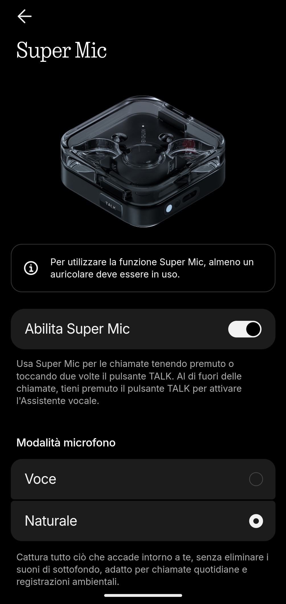 Il sistema Super Mic consiste in un doppio microfono con tecnologia di filtraggio ambientale integrato nella custodia di ricarica, capace di isolare la voce e ridurre il rumore circostante fino a 95dB, garantendo chiamate nitide in qualsiasi contesto semplicemente avvicinando la custodia alla bocca (massimo 15cm di distanza).