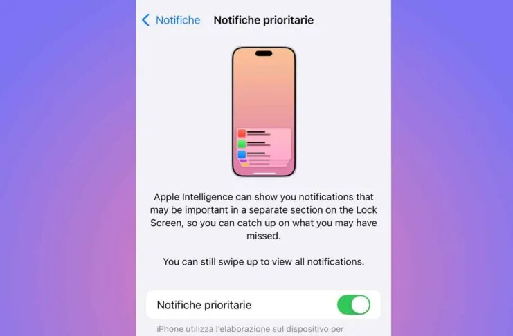 Questa funzione è legata a Apple Intelligence (opzione che anche noi utenti italiani possiamo attivare dalle Impostazioni) e permette di mostrare le informazioni più importanti, e riepiloghi aiutano a scorrere rapidamente le raccolte di notifiche mostrando i punti chiave direttamente sulla schermata di blocco.