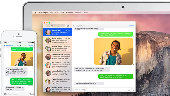 Mentre alcune importanti caratteristiche di Continuity, come handoff e le chiamate su Mac, sono già disponibili per tutti gli utenti che hanno a disposizione un dispositivo mobile con iOS 8 dispositivo e un Mac con OS X Yosemite, altre caratteristiche arriveranno solo e soltanto il prossimo lunedì con iOS 8.1. Ad esempio, attualmente, i classici SMS possono essere ricevuti solo su un iPhone, mentre iPad e Mac possono ricevere soltanto iMessage. Ebbene, da lunedi prossimo con iOS 8.1. gli SMS in entrata sul proprio iPhone potranno essere visualizzati anche su iPad e Mac; da questi due dispositivi sarà anche possibile rispondere agli SMS ricevuti. Inoltre, grazie a queste nuove funzionalità sarà anche possibile avviare da zero una conversazione basata su SMS direttamente da un Mac o da iPad.