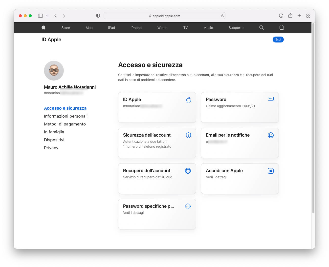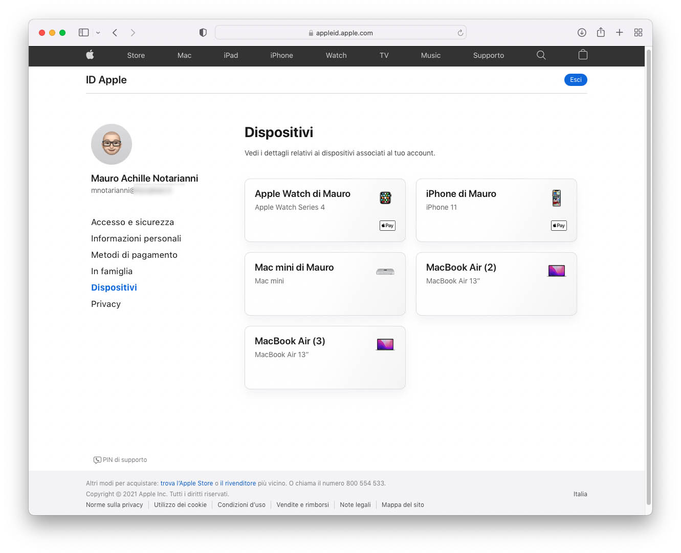 Dal sito dedicato all’Apple ID è possibile visualizzare dettagli relativi ai dispositivi associati al proprio account (es. il numero di serie), modificare dettagli relativi alle informzioni personali, ai metodi di pagamento predefiniti, visualizzare e gestire le informazioni che scegliamo di condividere con Apple e di ricevere da Apple.