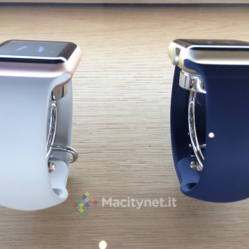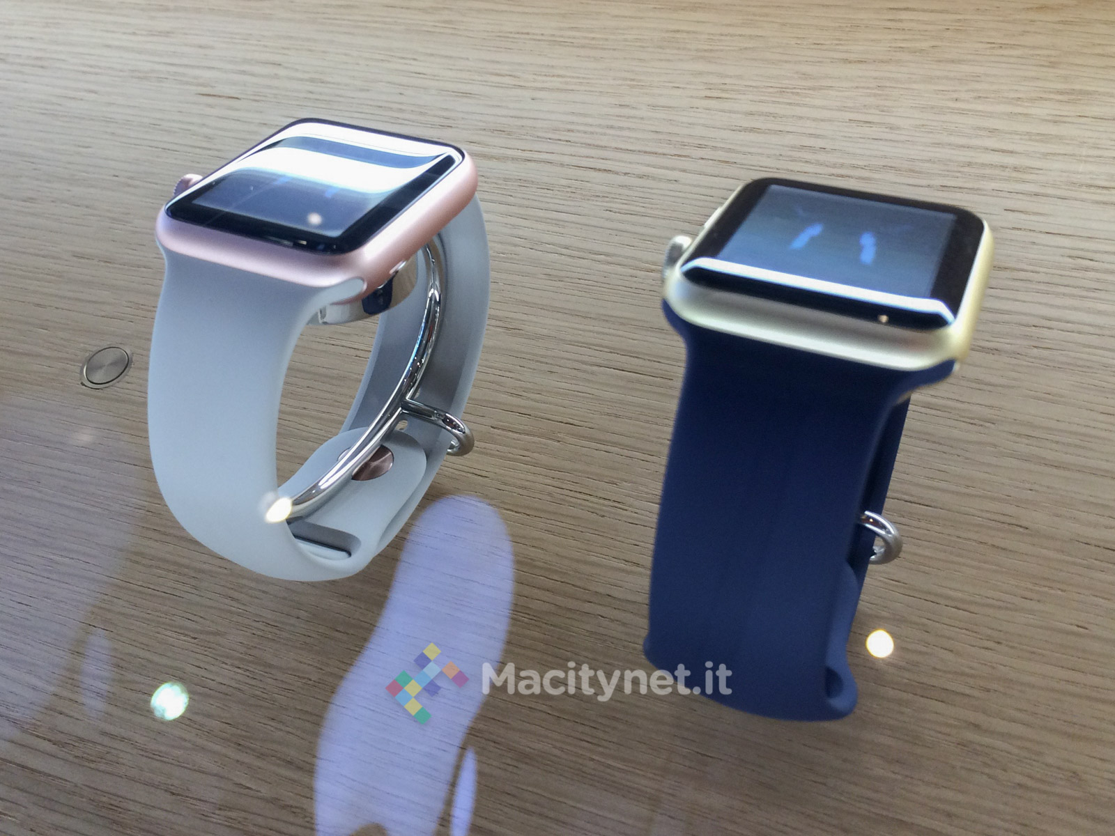 Il 9 settembre Apple ha infatti annunciato nuovi Apple Watch Sport con cassa in due nuovi colori, portando quindi a quattro il numero di combinazioni possibili per ciascuna misura (lo ricordiamo, 38mm e 42mm) e aumentando esponenzialmente quelle che si possono creare combinando le casse dell’orologio con gli altrettanto nuovi cinturini. Uno di questi, di colore blu, è proprio quello che accompagna la versione con cassa color oro, che nel tavolo da esposizione affianca un Apple Watch Sport con cinturino bianco e cassa in oro rosa. I cinturini sono in fluoroelastomero ed hanno i bottoni dello stesso colore della cassa, a dimostrazione del fatto che ciascun nuovo cinturino è opportunamente combinabile solo con specifici colori.