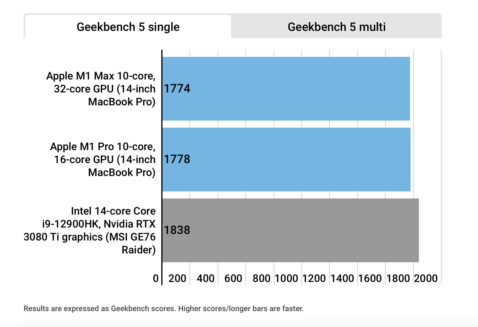 L’Intel Core i9-12900HK evidenzia con Geekbench 5 un punteggio multi-core di 12.707, offrendo sulla carta una velocità di circa il 4% superiore rispetto all’M1 Max; nei test single-core, Geekbench 5 evidenzia un punteggio di 1774 con l’M1 Max, contro i 1883 punti dell’Alder Lake, una differenza di circa il 3,5%.