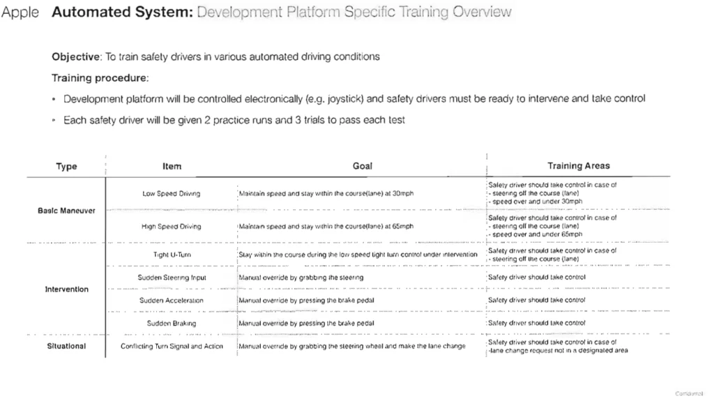E’ la redazione di Business Insider ad aver messo le mani su un documento intitolato “Sviluppo Piattaforma formazione specifica”, che si riferisce al “Sistema automatizzato Apple” utilizzato nei veicoli auto-guidati. Secondo il documento, i driver di Apple devono passare sette diversi test prima di essere completamente addestrati.