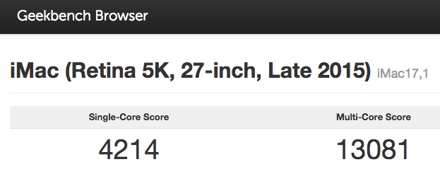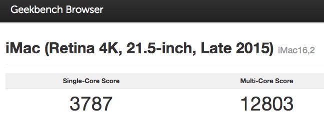 Per l’iMac di fascia alta fine 2015 da 21.5″ con Core i5 quad-core a 2.8 GHz sono indicati punteggi di 3,532 nei test single core e 11,865 nei test multi-core. Nell’equivalente modello fine 2013 con Intel Core i5 a 2.7GHz si ottengono punteggi rispettivamente di 3.175 (single-core) e 10,199 (multi-core).