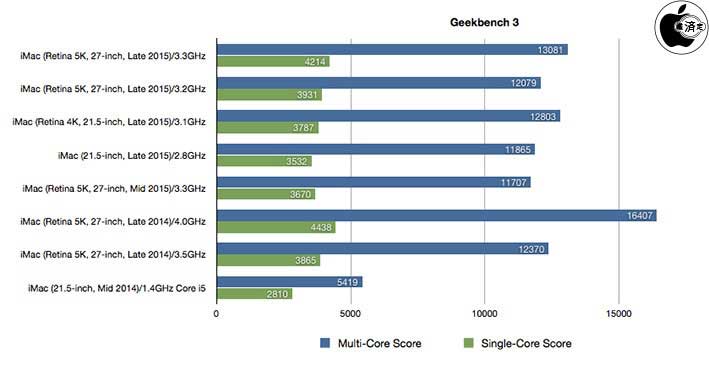 Anche la nuova serie di 27″ 5K è stata testata evidenziando per il modello base (3.2GHz quad-core Intel Core i5) punteggi di 3,931 (single-core) e 12,079 (multi-core). Con il modello high-end da 3.3GHz si ottengono punteggi di 4,214 (single-core) e 13,081 (multi-core). Con l’equivalente modello di iMac 5K fine 2014, nella configurazione base, si ottengono punteggi rispettivamente di 3,329 (single-core) e 10,632 (multi-core). L’iMac high-end 5K metà 2015 configurato con Intel Core i5 quad-core a 3.5GHz mostra punteggi di 3,844 (single core) e 12,192 (multi-core).