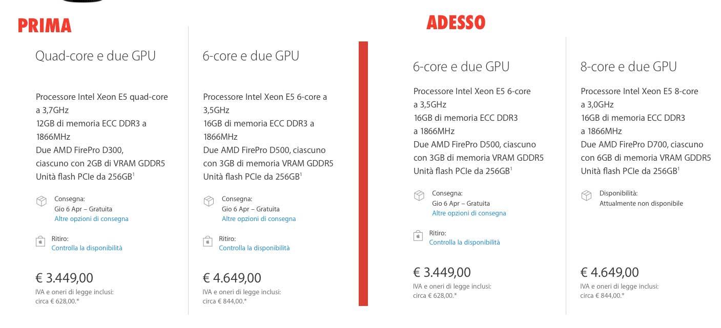 Tutti e due i modelli partono con 16GB di memoria RAM (ECC DDR3 a 1866MHz) e con unità flash PCIe da 256GB. In fase di configurazione è possibile cambiare la configurazione del processore (6-core a 3,5GHz con 12MB di cache L3, 8-core a 3,0GHz con 25MB di cache L3, 12-core a 2,7GHz con 30MB di cache L3), la memoria (fino a 64GB di RAM), lo spazio di archiviazione (iunità flash PCIe da 256G, 512GB o 1TB), Apple Mouse, Magic Mouse 2 o Magic Trackpad e software preinstallati (Final Cut Pro X o Logic Pro X). Come i precedenti, i prezzi partono da 3449,00 euro. Il modello base è disponibile subito; la variante 8-core è indicata come “attualmente non disponibile”.