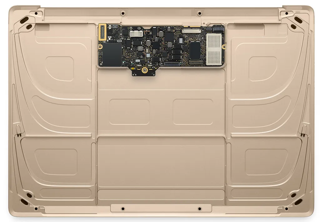Grande sforzo quello del team di progettazione di Apple che è riuscito ancora un volta a lavorare di sottrazione durante la riprogettazione del nuovo MacBook, rendendolo sottilissimo e più portatile che mai. La modifica più drastica è stata quello di eliminare la ventola e le porte aggiuntive (soluzione forse non apprezzata da tutti) e realizzare una scheda logica minuscola in confronto alle schede solitamente presenti nei portatili.