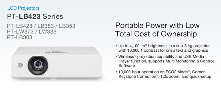 Anticipato da Panasonic anche il  lancio della serie PT-LB423, che si distingue per essere la più leggera, con un peso di 2,9 kg. Appartengono a questa nuova line up sei differenti modelli, con 3.600 lumen di luminosità alla risoluzione WXGA per  PT-LW373, e fino a 4.100 alla risoluzione XGA per PT-LB423. Dotata di obiettivo con zoom manuale 1,2x, la nuova serie permetterà di proiettare da un ampio range di distanze, ed entrambe le nuove integreranno un terminale per rete LAN a cavo e un ingresso USB per collegare un modulo wireless opzionale, che prende il nome di ET-WML100. I nuovi proiettori supportano la riproduzione di immagini tramite lettore multimediale USB integrato, mentre un secondo terminale USB consente l’audio plug-and-play.
