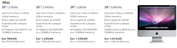 I prezzi sono stati ribassati e il modello di ingresso ha ora un costo di 999 ‘‚¬ (contro 1199 ‘‚¬). Il modello da 20 pollici con processore da 2,66 GHz costa 1299 euro (erano 1449 ‘‚¬ in precedenza per un processore da 2,4 Ghz e schermo da 24 pollici) e il nuovo iMac da 24 pollici con processore da 2,8 Ghz costa 1599 ‘‚¬ (contro i precedenti 2219 ‘‚¬ o i 1449 per il modello da 2,6 Ghz con schermo da 24 pollici). Il modello con processore da 3,06 Ghz costa 1919 euro (che può essere paragonato al sopraccitato modello da 2,8 Ghz con schermo da 24 pollici che costava 2219 euro). La versione top precedente aveva, oltre che un processore meno potente, anche una scheda grafica standard, identica a quella degli altri iMac. Nel caso specifico ha invece una scheda grafica significativamente più potente.