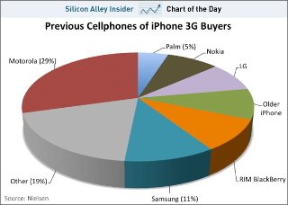 Secondo la survey di Nielsen (riferita al mercato statunitense) per il secondo trimestre del 2009, intitolata Mobile Insights Survey, iPhone “ruba” la scena soprattutto a Motorola, ma anche a Samsung e ai marchi minori.