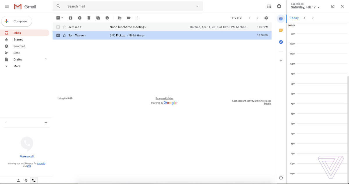 E’ la redazione di The Verge ad aver ottenuto una raccolta di immagini che mostrano esattamente la nuova UI immaginata da Google per il proprio servizio mail, che sarà a breve disponibile su PC e Mac. Stando alle immagini che postiamo appena in basso, la nuova interfaccia grafica di Gmail su web sembra richiamare quella già disponibile per le app iOS e Android, con molti elementi tipici del Material Design. Una delle principali differenze visive rispetto all’attuale versione è la presenza di una nuova barra laterale che fornisce diverse opzioni di personalizzazione. Gli utenti potranno infatti scegliere di aggiungere Google Calendar, Google Keep, o Google Tasks nella finestra laterale, o comprimere completamente tali opzioni concentrarsi solo sulla casella di posta elettronica.