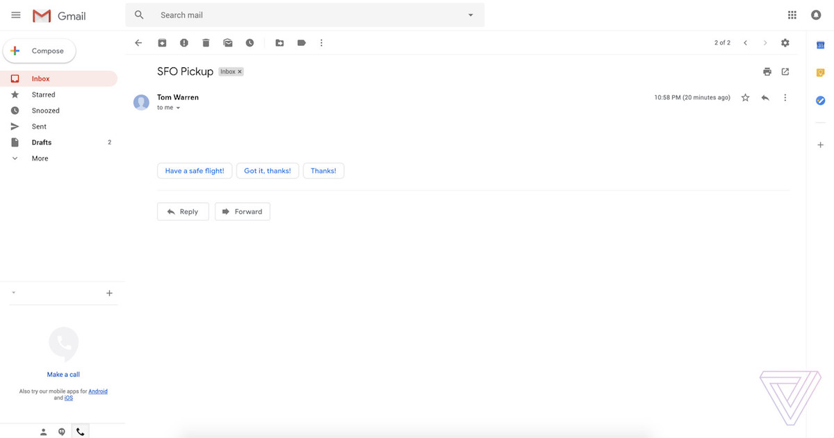 La vista compatta è la più simile al design di Gmail esistente, consentendo agli utenti di mantenere un layout familiare. Ci saranno anche due nuove caratteristiche, ossia le risposte intelligenti e la funzione snooze, entrambi riprese dalla Posta in arrivo dell’app Gmail. Risposte intelligenti è presente anche su iOS e Android, e fornisce agli utenti risposte semplici per replicare rapidamente alle e-mail in entrata. Snooze, invece, consente agli utenti di rimuovere temporaneamente le email e promemoria dalle loro caselle di posta, fino a che non decideranno di farle riapparire.