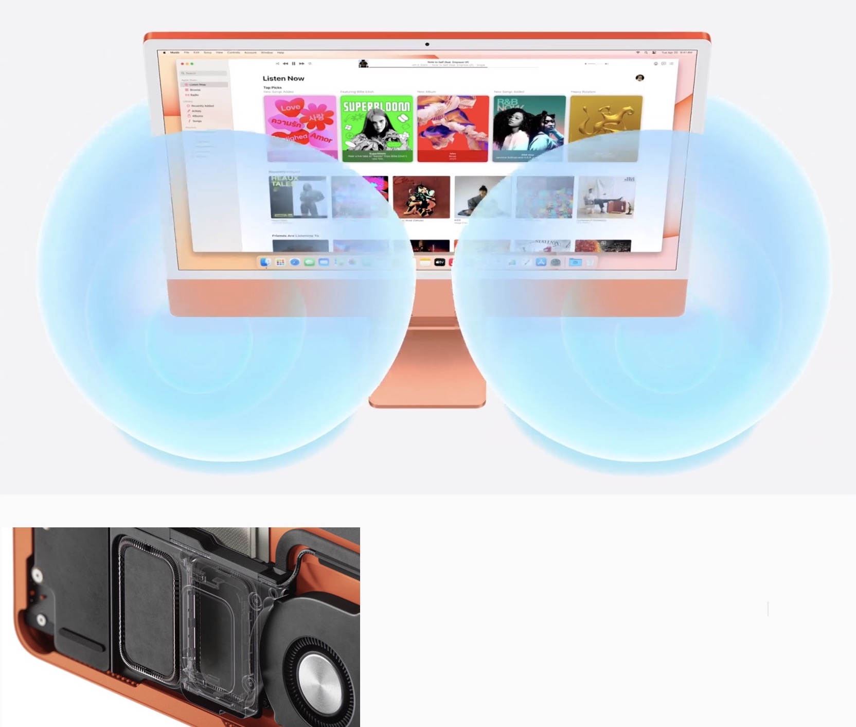 Lo spessore ridotto ad poco più di un centimetro (per la precisione 11,5 mm e sul lato è presente anche il jack cuffie 3,5mm) è reso possibile dall’architettura system-on-chip e dalla efficienza energetica di M1, con scheda logica e termica notevolmente consolidate e ridotte di dimensioni rispetto a quelle della generazione precedente. Nel complesso, Apple stima che il design molto più compatto riduce il volume di iMac del 50 percento, consentendogli di occupare meno spazio e di adattarsi facilmente a un numero ancora maggiore di scrivanie. Da notare, peraltro, che lo schermo è da 24 pollici, quindi più grande rispetto alla versione da 21,5 pollici delle generazioni appena pregresse.