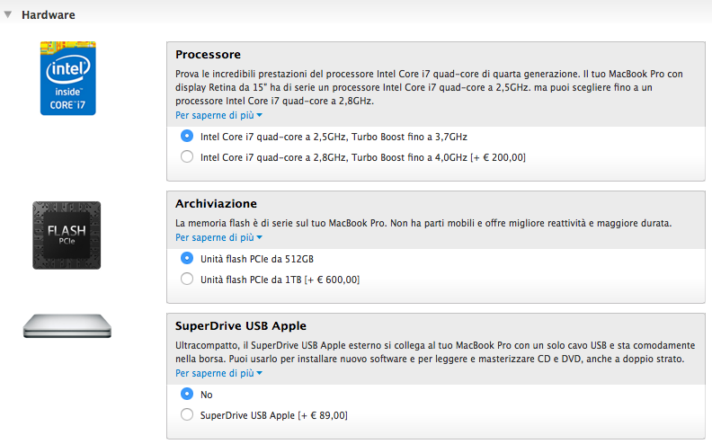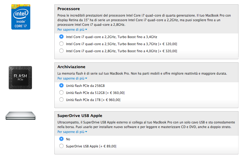 In questo modello è possibile installare un processore più veloce Intel Core i7 quad core da 2,5 GHz con Turbo Boost fino a 3,7 GHz a 120 euro in più, oppure 320 euro in più per la CPU top di gamma da 2,8 GHz con Turbo Boost fino a 4 GHz. Gli utenti che invece desiderano una unità flash PCIe più capitente possono optare per quella da 512 GB a 360 euro in più oppure da 1 TB a 960 euro in più.