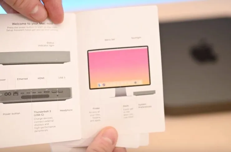 Apple avrebbe potuto disegnare uno schermo anonimo ma si vede un display in linea con il Mac mini. Lo schermo sul foglietto sembra l’ultimo Thunderbolt Display progettato “in casa” dalla Mela ma con un diverso design: i bordi sono più sottili e (l’immagine è sfuocata) i bordi sembrano arrotondati.