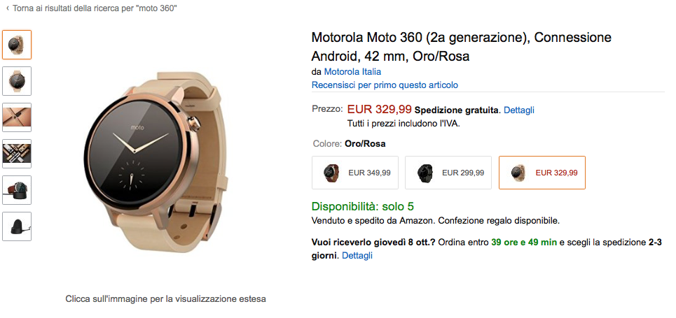 Dell’estetica dell’orologio si sa già tutto da qualche settimana: il display circolare presenta la stessa banda nera del primo modello, mentre il pulsante laterale è stato spostato più in alto e il quadrante dispone adesso di due alette che lo rendono ancor più classico ed elegante. Su Amazon Italia il modello base del nuovo Moto 360 costa 299 euro, in colorazione nera e con cinturino da 42 mm. Solo 30 euro in più, dunque 329 euro, servono per acquistare il modello in colorazione oro e rosa, mentre a 349 euro è disponibile una variante con cinturino da 46 mm, con cinturino in pelle marrone. Il modello base ha una disponibilità immediata, quello oro e rosa presenta scorte molto limitate e il modello più grande non è attualmente disponibile.
