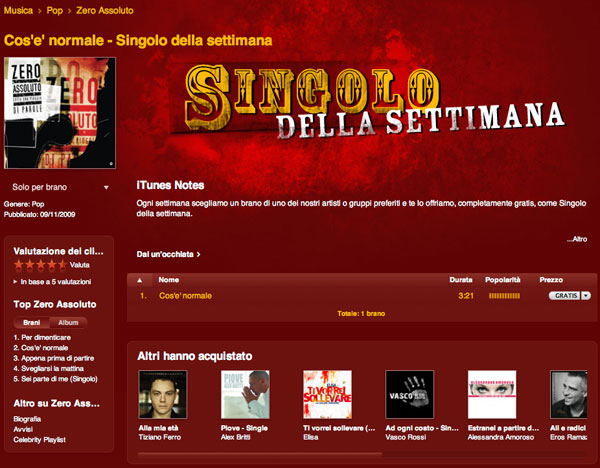 Anche per questo secondo brano proposto gratuitamente lo staff Apple ha scelto autore e brano di un certo spessore, ancora una volta operando una scelta localizzata nel regalare autori italiani. Cos’è normale degli Zero Assoluto può essere scaricata gratuitamente a partire da questa pagina di iTunes Store.