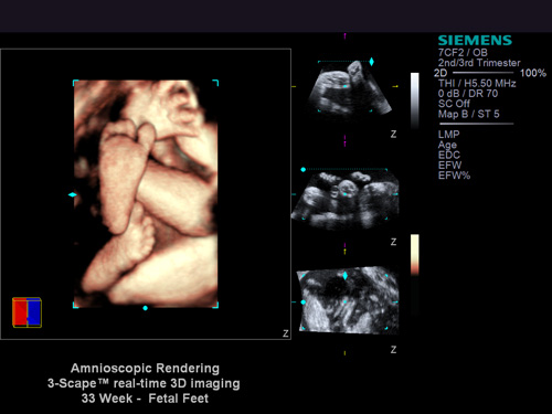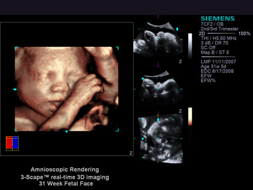 Le immagini cliniche, ottenute con il sistema a ultrasuoni ACUSON S2000, sono ulteriormente perfezionate con il rendering amnioscopico, una tecnologia di Siemens che produce immagini prenatali fotorealistiche e in 3D. Mentre le tecnologie ultrasoniche in 3D tradizionali si avvalgono di monitor bidimensionali per la visione d’immagini tridimensionali, la tecnologia 3D Vision di Nvidia permette di vedere le immagini in 3D effettivo, migliorando nettamente l’esperienza complessiva.