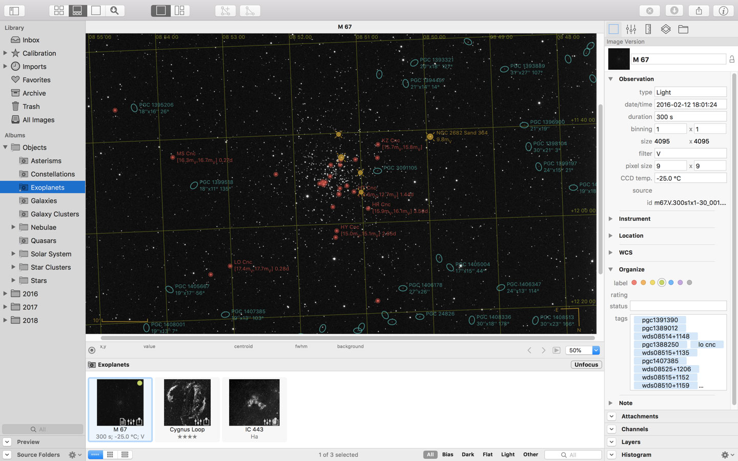 È possibile comprendere cosa c’è in un’immagine sovrapponendo milioni di stelle, galassie, nebulose planetarie, esopianeti e altri oggetti del cataloghi Messier, NGC/IC, Tycho-2, CGPN, GCVS, WDS e PGC o aggiungere cataloghi UCAC4 e USNO-A2.0 per altre 500 milioni di stelle.