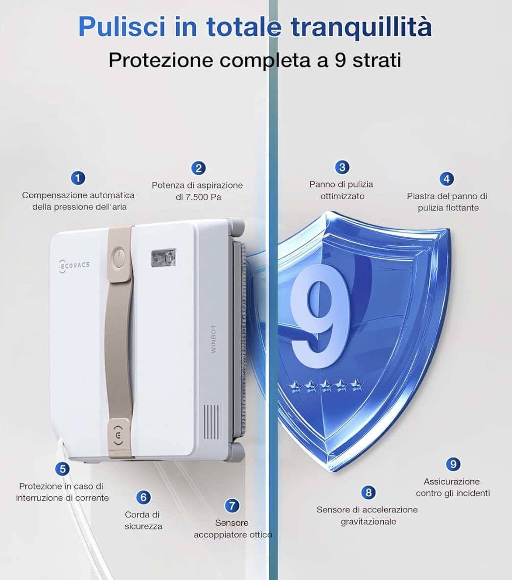 Infine la preocupazione maggiore per chi si avvicina ad un robot di questo tipo: sarà sicuro o cadrà dalla finesta con conseguenze sul suo funzionamento o pericolo di danni a terzi?WINBOT MINI è dotato di un sistema di sicurezza a 9 livelli tra cui la protezione da interruzione di corrente e l’assorbimento degli urti, il robot garantisce un funzionamento sicuro in tutte le condizioni. La sua potenza di aspirazione di 7.500 Pa mantiene il WINBOT saldamente attaccato alla finestra.