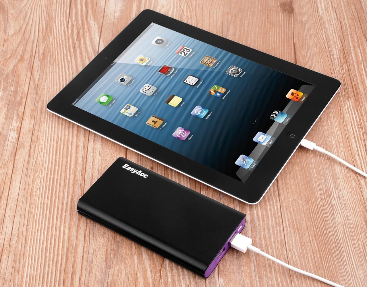 La batteria è quella di EasyAcc, molto popolare (è stata a lungo la più venduta su Amazon) che abbiamo recensito su Macitynet qualche mese fa, qui in versione viola. Non solo ha una elevata capacità, ma è anche dotata di due porte di cui una da 2.1A, quindi in grado di ricaricare a piena potenza anche un iPad contemporaneamente ad un iPhone o un altro telefono qualsiasi.