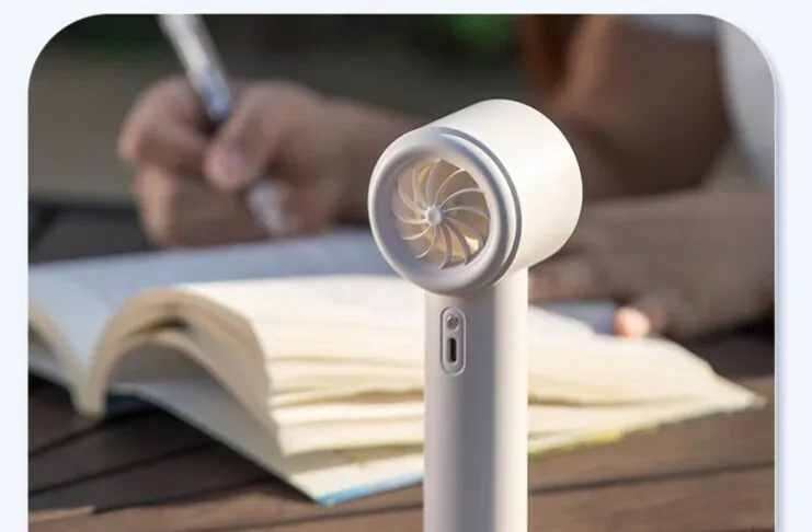 Oltre che estremamente portatile è anche possibile utilizzarlo come mini ventilatore da scrivania, grazie ad una basa comunque piatta, che gli consente di rimanere “in piedi” su una qualsiasi superficie.