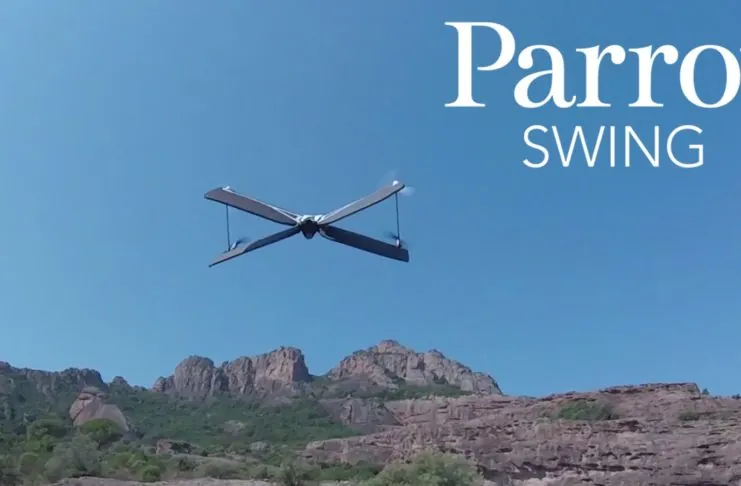 Il drone Swing è anch’esso una evoluzione della precedente serie Airbone, con un sistema di ali del tutto nuovo e molto più grande. Il drone inizia con un volo in modalità elicottero, ma poi può spostare la propria asse e sfruttare le ali come fosse un piccolo aereo. In questa seconda modalità il volo è molto più preciso sulla lunga distanza e, ad una prima impressione, anche più soddisfacente. Data la particolarità del drone e del tipo di volo, Parrot ha inserito un pulsante che permette al drone di bloccarsi in aria e rimanere in sospensione in modalità elicottero, in modo che l’utente sia in grado di analizzare la posizione e ricalcolare la nuova traiettoria.