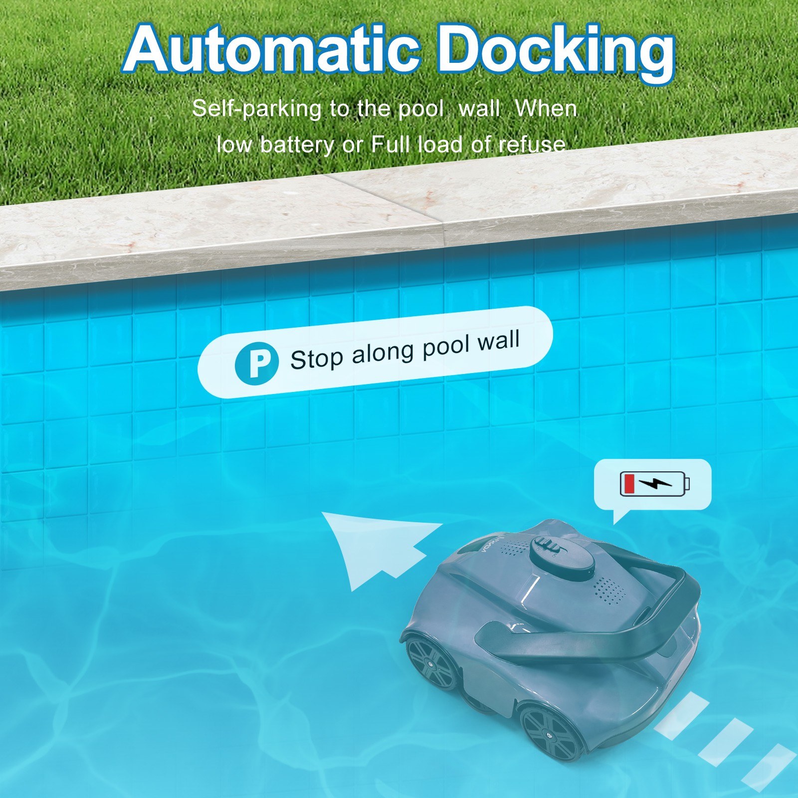 Questo pulitore è alimentato da una batteria interna, evitando così l’ingombro dei cavi e offrendo una maggiore comodità d’uso. Al termine del ciclo di pulizia, si sposta automaticamente verso il bordo della piscina per un facile recupero.
