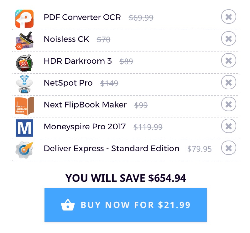 Tra i tanti che si possono aggiungere nel carrello personalizzabile segnaliamo Noiseless, per correggere e ridurre rumore e imperfezioni dalle vostre fotografie meno riuscite. Ci sono poi NetSpot Pro, una potente applicazione usata dai professionisti dei network per effettuare una ricognizione sulla copertura del Wi-Fi verificando parametri scientifici ed oggettivi che permettono di ottimizzare il segnale, e FX Photo Studio, un programma per arricchire e migliorare le fotografie utilizzato sia dagli appassionati che dai professionisti: offre 159 effetti già pronti, possibilità di modificare i filtri e semplice interfaccia.