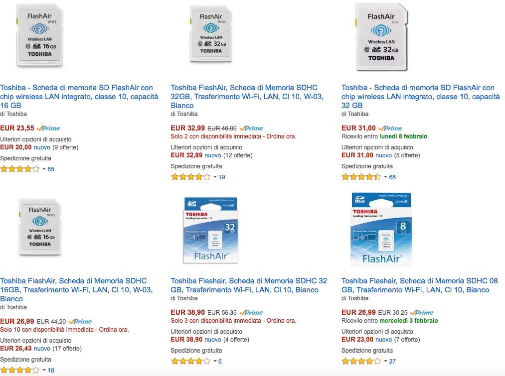 Su Amazon, a questo indirizzo è possibile acquistare tutti i modelli di schede di memoria SD FlashAir di Toshiba.