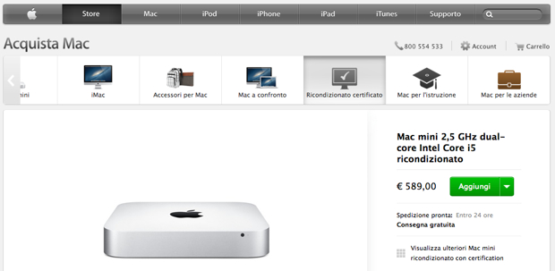 Per gli utenti alla ricerca di un computer Mac con un occhio di riguardo al portafogli la sezione ricondizionati Apple Store online propone 6 sistemi Mac a meno di 1.000 euro. La macchina dal prezzo più abbordabile è il Mac mini del 2011 con processore Intel Core i5 dual core da 2,5GHz, 4GB di memoria RAM e disco fisso da 500GB a solo 589 euro, un prezzo molto interessante per gli utenti che necessitano di un Mac per la produttività office e per la gestione di tutte le app per l’uso personale e il tempo libero.