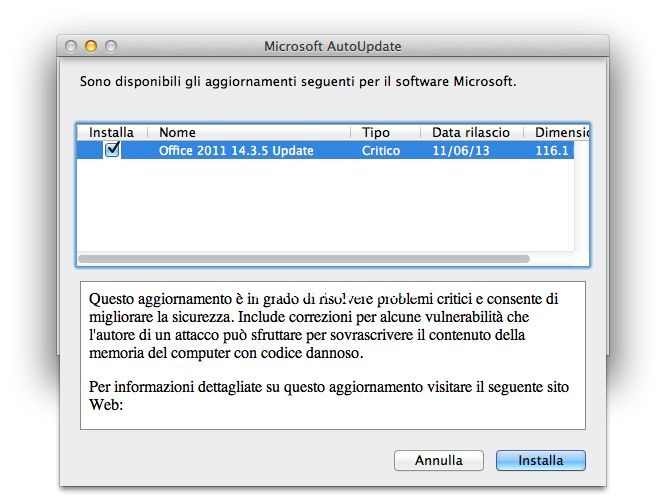 Microsoft ha rilasciato un aggiornamento per Office 2011. L’update (116.1MB) porta il pacchetto alla versione 14.3.5 e include correzioni per risolvere vulnerabilità che l’autore di un attacco poteva sfruttare per sovrascrivere il contenuto della memoria del computer con codice dannoso. L’update risolve un problema con il flag delle mail in Outlook che risultavano corrotte usando account IMAP o impostate erroneamente come se il messaggio non fosse stato spedito.
