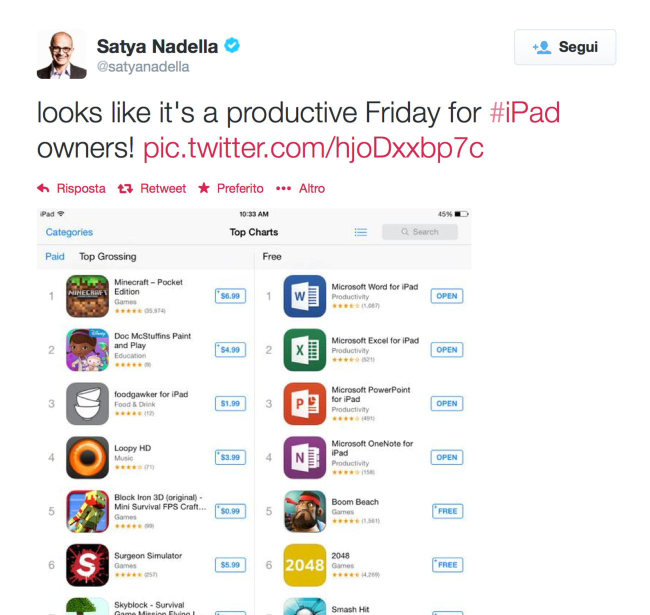 ISatya Nadella, che secondo qualcuno avrebbe personalmente forzato il rilascio di Office per iPad, pronto da tempo ma trattenuto prima del suo arrivo da dubbi e incertezze, è soddisfatto e twitta: «È stato un venerdì produttivo per chi ha un iPad» e allega la classifica delle applicazioni gratuite con Word, Excel e Powerpoint ai primi tre posti.