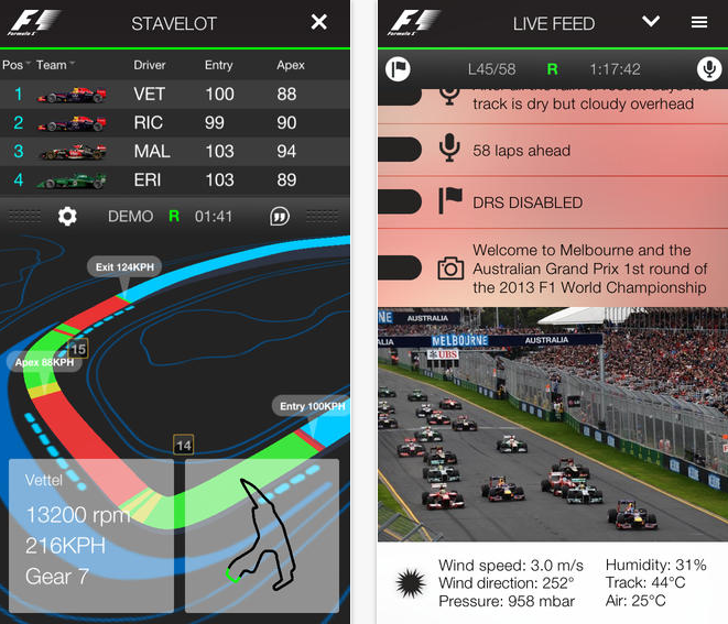 Anzitutto Official f1 permette a ciascun utente di consultare le classifiche, i tempi sul giro, news e informazioni sempre aggiornate sul mondo della Formula 1, riprese direttamente dal sito ufficiale formula1.com. L’applicazione accompagnerà l’intera stagione 2014, proponendo un’interfaccia grafica in tutte per tutto simile a quella presente sui computer che solitamente le varie scuderie utilizzano al muretto. L’applicazione, come già accennato, è disponibile gratis al download anche se contiene al suo interno un Premium Pass per l’intera stagione, in grado di fornire informazioni suppletive agli appassionati. Costa 9,99 euro e permette di ascoltare anche i team radio, ossia le comunicazioni tra muletto e monoposto, di leggere i messaggi dei controllori di gara, e tanto altro ancora.