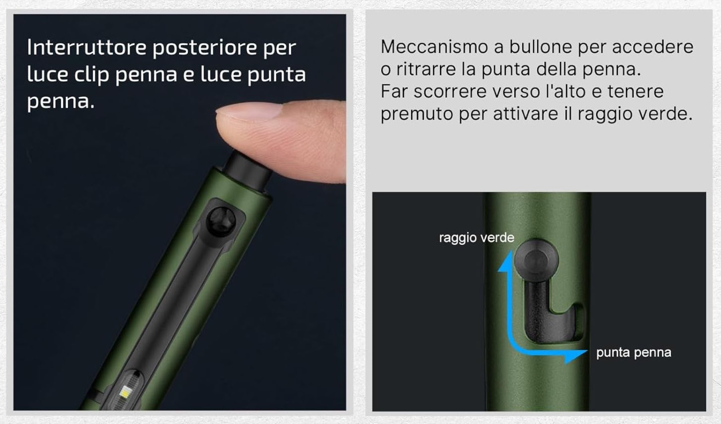 C’è poi il puntatore laser verde, posizionato all’estremità opposta, pensato per presentazioni o per indicare oggetti a distanza in modo preciso. Qui precisiamo che la potenza del laser è nella norma per un uso civile (meno di 1 mW), quindi conforme alle normative europee.