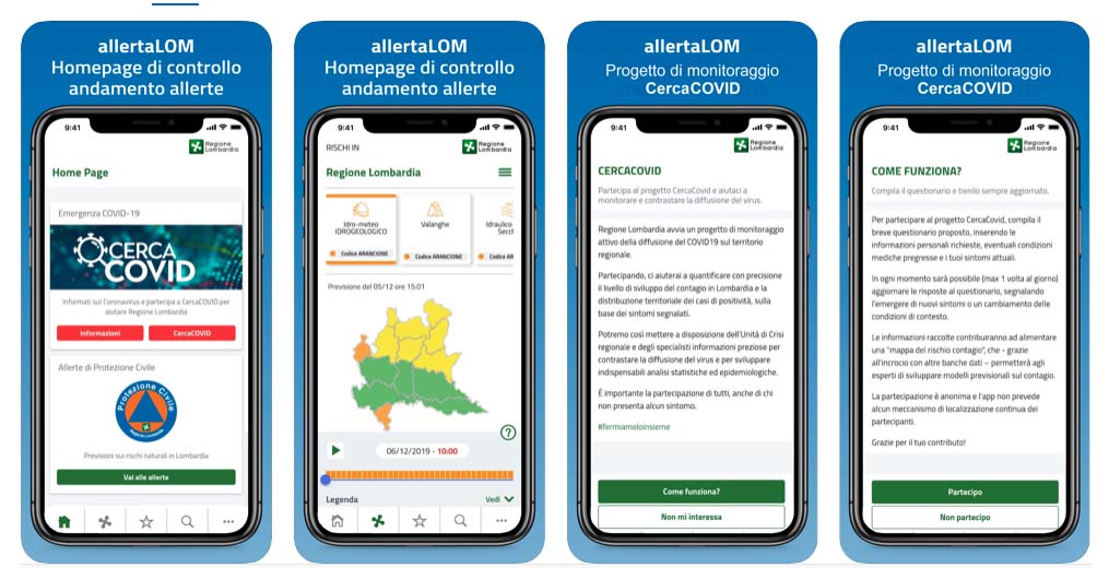 La Lombardia ha una sua app denominata AllertaLOM (qui per iPhone, qui per Android) già utilizzata per le allerte di Protezione Civile; dall’inizio dell’emergenza Coronavirus l’app in questione permette di ricevere notifiche e informazioni. E’ disponibile su Apple Store, su Google Play Store e Huawei Store ed è indicata dalla Regione come un importante strumento per il monitoraggio e la mappatura della diffusione del Covid-19. Con gli ultimi aggiornamenti gli utenti possono compilare un questionario integrato all’interno dell’app che rende possibile raccogliere dati, in forma anonimizzata, e mettere a disposizione dell’Unità di Crisi regionale e degli specialisti informazioni complete e strutturate sulla diffusione del contagio sul territorio lombardo.